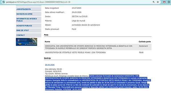 Numai că, Sindicatul din Universitatea de Științe Agricole și Medicină Veterinară a Banatului din Timișoara continuă procesul pentru a arăta conducerii Universității că nu poate încălca regulamentele de funcționare când și cum dorește. Magistrații Tribunalului Timiș s-au pronunțat prin Hotarârea 479/2026 din 26.03.2026 prin care se admite cererea sindicatului: „Admite acţiunea formulată de reclamantul SINDICATUL DIN UNIVERSITATEA DE ȘTIINȚE AGRICOLE ȘI MEDICINĂ VETERINARĂ A BANATULUI DIN TIMIŞOARA în numele reclamantei Popescu Georgeta Sofia în contradictoriu cu UNIVERSITATEA DE ŞTIINTELE VIETII REGELE MIHAI I din TIMIŞOARA. Anulează decizia de sancţionare cu avertisment scris, emisă de pârâtă la data de 26.06.2025 şi contestată în prezenta cauză. Obligă pârâta la plata sumei de 4760 lei cu titlu de cheltuieli de judecată Cu drept de apel în 10 zile de la comunicare, ce se depune la Tribunalul Timiş. Pronunţată prin punerea soluţiei la dispoziţia părţilor prin intermediul grefei instanţei, astăzi, 26.03.2026.”
